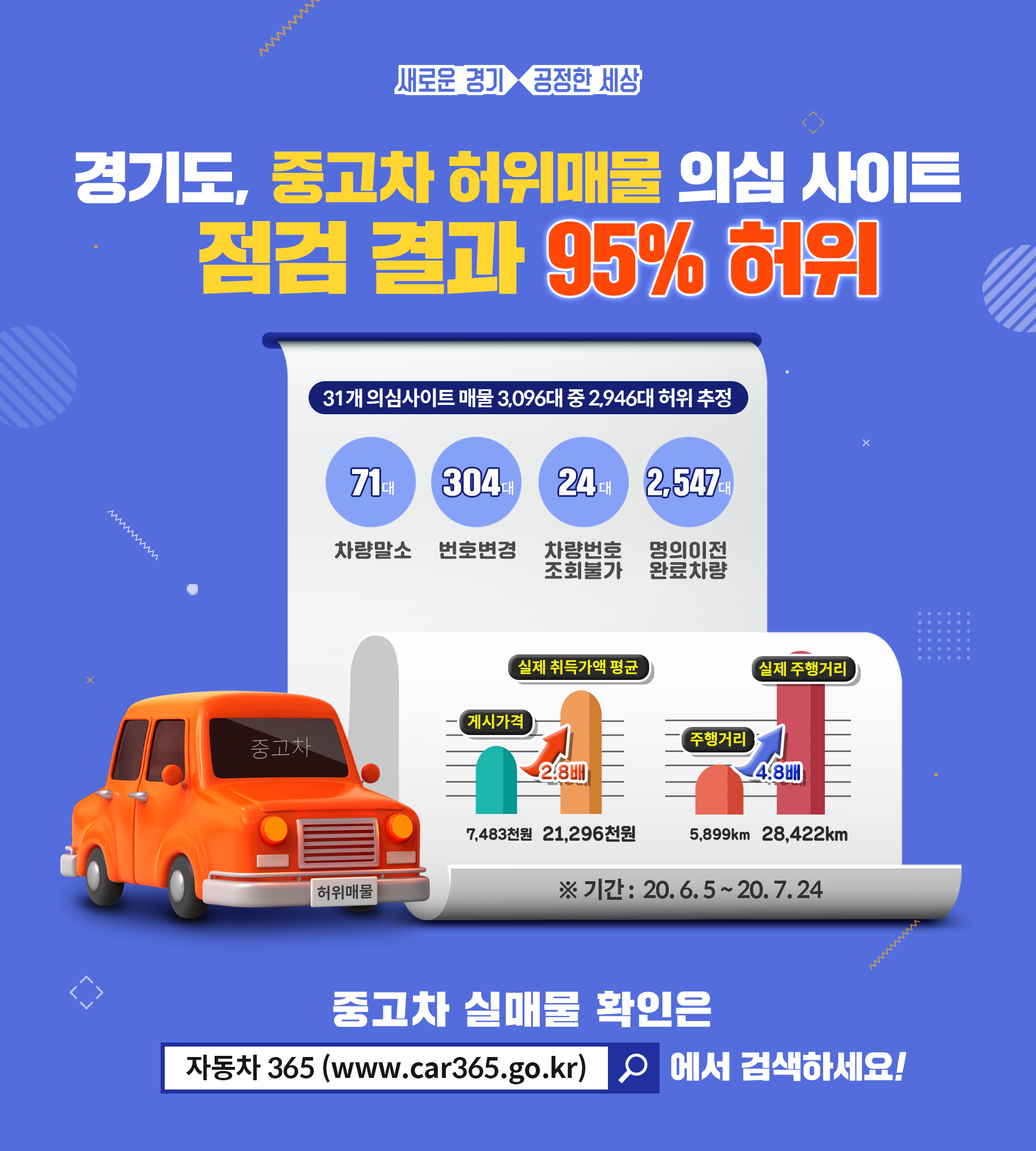 경기도가 6월 5일에서 7월 24일까지 차량 소재지, 사업자 정보, 차량 시세 등의 내용이 부실한 31개 사이트를 선정해 사이트당 100대를 임의 추출한 뒤, 자동차등록원부와 대조한 결과 총 3,096대 중 2,946대(95.2%)가 허위매물인 것으로 드러났다.