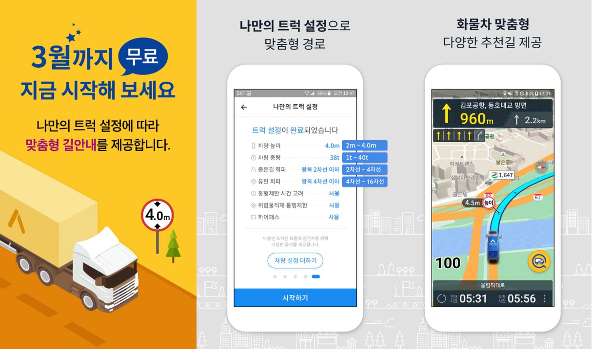 운전자들이 설정 메뉴에서 화물차 높이, 총중량, 좁은길, 유턴 제한 등의 항목을 자신의 차량에 맞게 입력하면, 설정값에 따라 높이가 낮은 터널, 중량 제한이 있는 교량, 진입이나 유턴이 어려운 좁은길 등을 회피해 안전하고 빠른 맞춤형 경로를 제공한다.